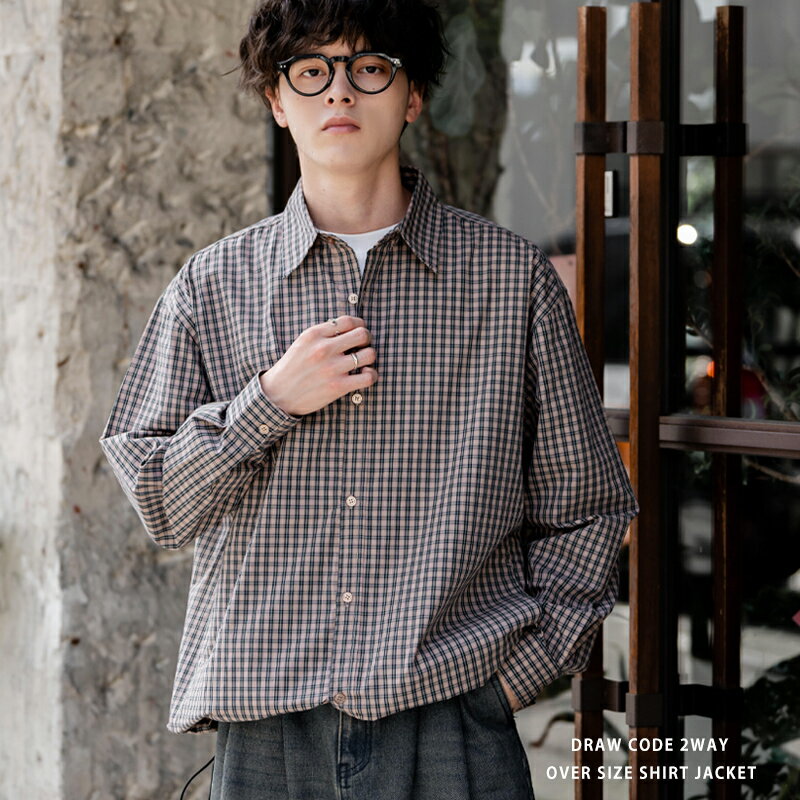 【SALE⇒50%OFF】シャツジャケット シャツ 長袖 メンズ レディース レギュラーカラー ドローコード バルーンシルエット オーバーサイズ ビッグシルエット リラックス ゆったり ライトアウター チェック ストライプ 無地 白シャツ きれいめ アウトドア ストリート 14761