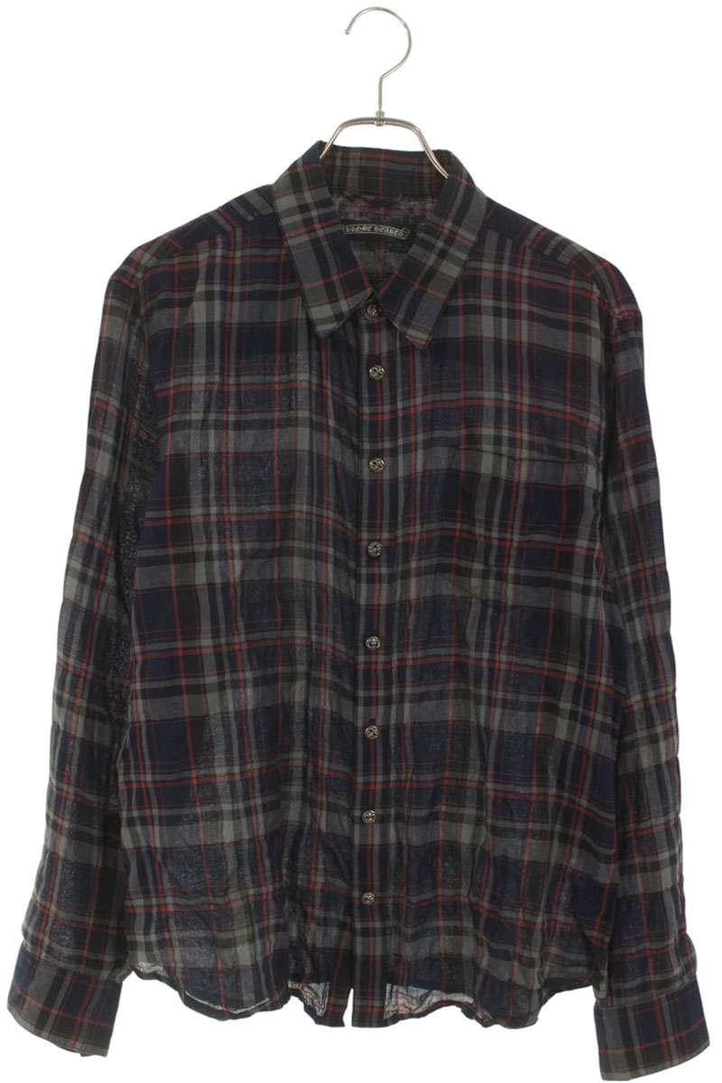 CHROME HEARTS クロムハーツ 長袖 チェックシャツ クロスボールボタン クロスパッチ ブラウン ブルー サイズL 美品 中古 4b004594
