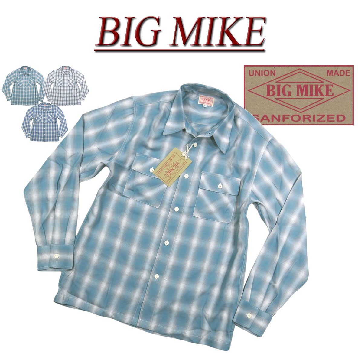 【3色3サイズ】 ad471 新品 BIG MIKE 復刻 オンブレチェック レーヨン混 長袖 チェックシャツ 102425012 メンズ ビッグマイク L/S OMBRE CHECK WORK SHIRTS ワークシャツ BIGMIKE 【smtb-kd】