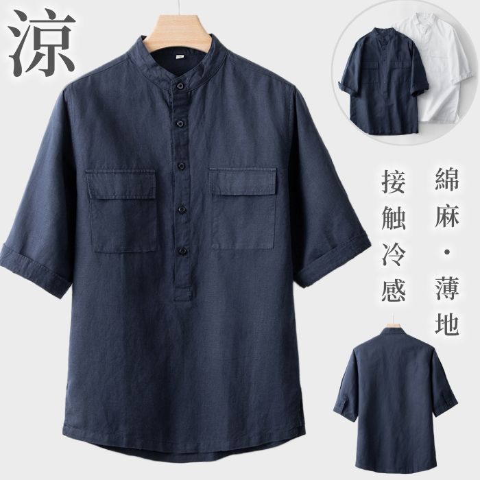 リネンシャツ 五分袖シャツ メンズシャツ 立ち襟 スタンドカラー ヘンリーネック カジュアルシャツ 綿麻シャツ 夏服 トップス