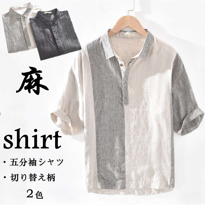 シャツ 麻100% 五分袖 メンズシャツ リネンシャツ 麻シャツ ヘンリーネック カジュアルシャツ shirt 切り替え柄 シンプル 薄地 トップス 涼麻シャツ 夏物 冷感