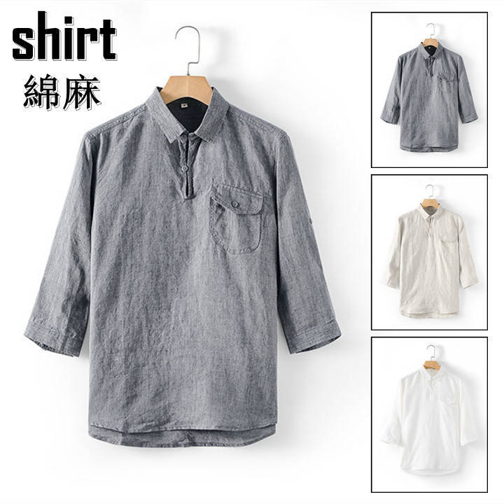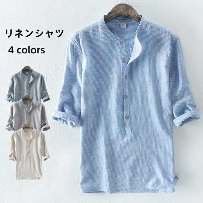 シャツ 七分袖シャツ リネンシャツ 涼しい メンズシャツ プルオーバーシャツ スタンドカラー 綿麻シャツ 無地 ヘンリーネック カジュアルシャツ 立ち襟 shirt シンプル 薄地 軽くて トップス 夏物 新品 ファッション 父の日 プレゼント ギフト