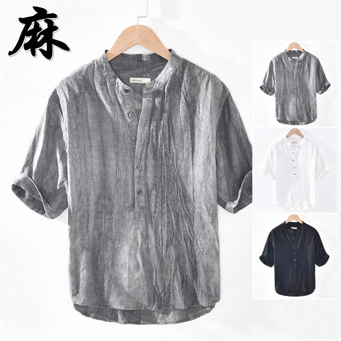 シャツ リネンシャツ 無地 メンズ 半袖シャツ ヘンリーネック カジュアルシャツ 立ち襟 プルオーバー shirt 無地 綿麻 スタンドカラー トップス シンプル 涼しい 薄地 普段着 夏物 新品 S-XXL