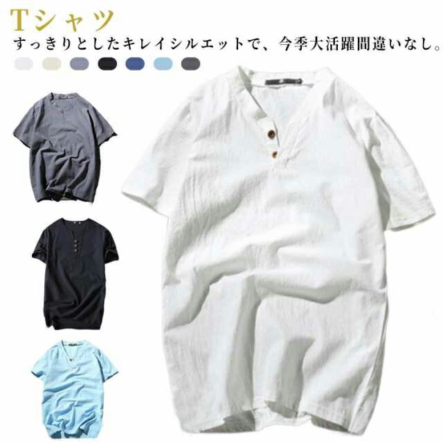 ティーシャツ 半袖 メンズ リネンTシャツ おしゃれ ヘンリーネックTシャツ トップス 無地 Vネック 半袖Tシャツ 綿麻 Tシャツ Tシャツ 夏服 夏物 父の日 黒 白 リネンシャツ スポーツ ダンス ゴルフ 大きいサイズ ルームウェア 部屋着 父の日