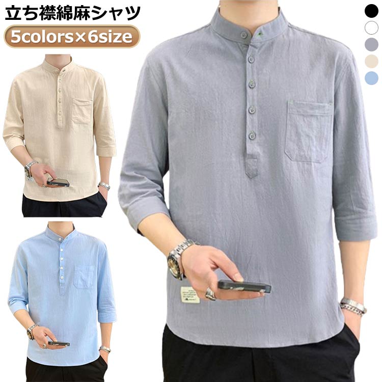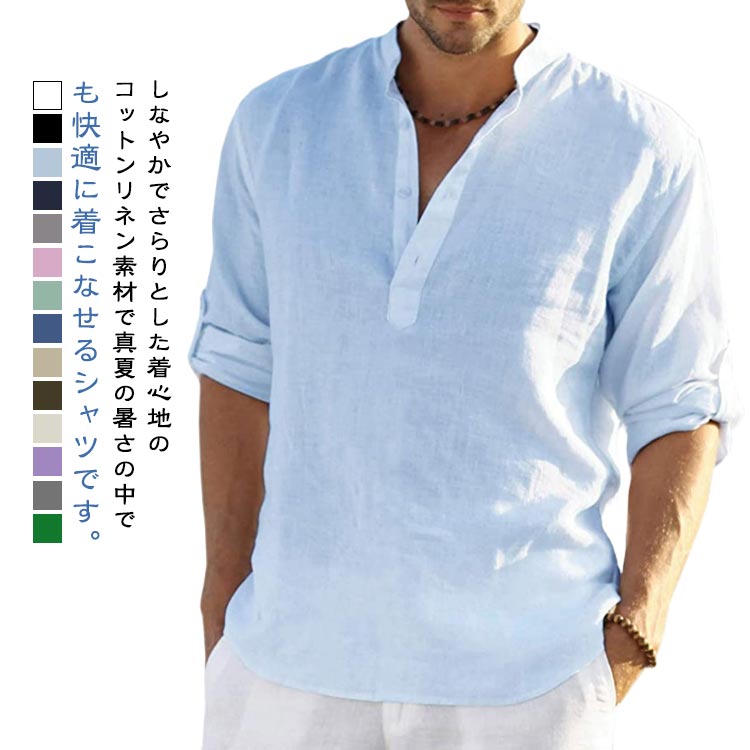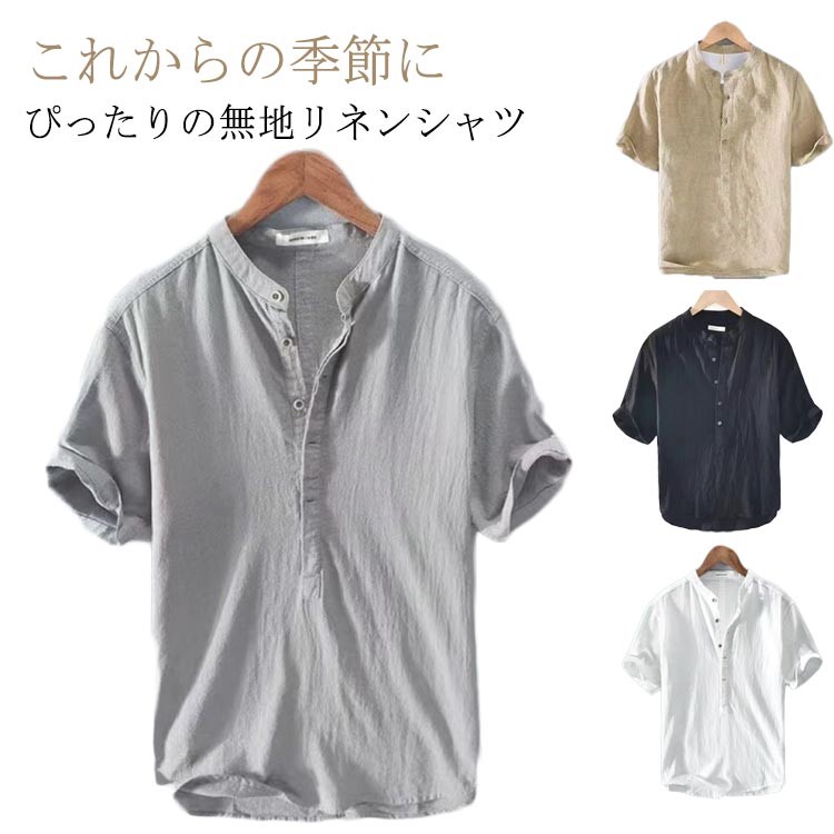 シャツ メンズ 綿麻シャツ リネンシャツ 麻 リネン 夏 半袖 七分袖 綿麻tシャツ 立ち襟 ヘンリーネック カジュアル 男性用 お兄系 無地 夏用 通勤 通学 大きいサイズ ブルー ベージュ グリーン ホワイト ピンク グレー カーキ ブラック ネイビー S-4XL