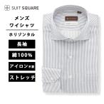 【スーツスクエア】ワイシャツ 長袖 ノンアイロン 形態安定 ホリゾンタルカラー ストライプ BASIC 綿100% ドレスシャツ ネイビー系 ウォッシャブル ストレッチ