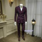 ツーピース セレモニースーツ ダブルブレストスーツ メンズ セットアップ ワインレッドチェック柄 細身 紳士服 結婚式 春秋 2点セット
