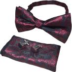 蝶ネクタイ ポケットチーフ カフスボタン 3点セット ペイズリー柄 ボウタイ タキシード 結婚式 パーティー (ダークレッド)