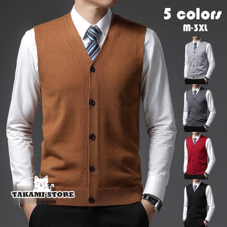 【期間限定10%OFF】前開きニットベスト メンズ 無地 Vネック ノースリーブ トップス カジュアル ボタン式 男性用 秋 おしゃれ 父の日