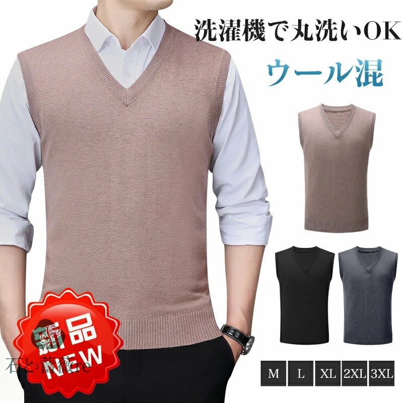 【早割り10%OFF】ニット ベストメンズ ウール混 洗える ウォッシャブル 大きいサイズ M〜3XL セーターベスト 天竺 Vネック チョッキ ジレ ビジネス カジュアル 無地 ノースリーブ セーター 定番 春 秋 冬 防寒 防風 秋用 冬用 男性用 ゴルフ ギフト プレゼント