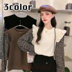 ブラウス ニット 長袖 重ね着風 レディース トップス ラウンドネック ドッキングブラウス 花柄 フリル袖 セーター風 無地 プルオーバー カジュアル