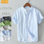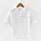 シャツ 綿麻 トップス 白シャツ リネンシャツ カジュアルシャツ コットンリネン バンドカラー 詰襟 半袖 メンズ 夏 父の日