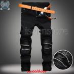 ブラックデニム バイカーデニム メンズ ジーンズ Gパン ストレッチ デニムパンツ レザー ジップZIP パッチワーク スリム ストレートパンツ 秋 冬 カジュアル