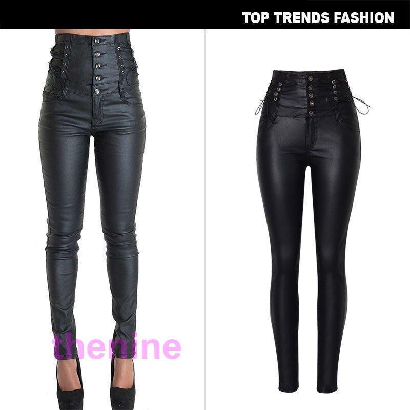 【期間限定10%OFF】レザーパンツハイウエストロングパンツPU革パンツスキニーパンツレギンス着痩せ無地スリムパンツボトムス薄手長ズボンライダースパンツ