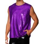 Lars Amadeus メンズ シャイニング ベスト ノースリーブ チェック柄 メタリック タンク トップ ノースリーブ クラブ パープル L