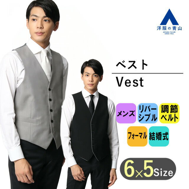 【洋服の青山】リバーシブルベスト だけ ジレ メンズ 春夏 秋冬 グレー 灰色 / ブラック 黒無地 ウエスト調節ベルト 光沢 華やか フォーマル 結婚式 披露宴 2次会 パーティ 式典 会食 セレモニー 男性 50代 40代 30代 20代 トップス 表裏 2WAY RARE BLACK