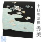 名古屋帯 秀美 黒 正絹 絽 海 貝殻 波 流水 観世水 カジュアル 仕立て上がり 夏物 お洒落 九寸 帯 No.6-2211