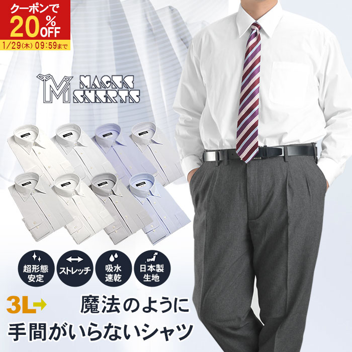 【20%OFFで3,184円】 【新作】 ワイシャツ 大きいサイズ ノーアイロン 長袖 メンズ 形態安定 日本製 吸水速乾 ストレッチ MAGIC SHIRTS ニットシャツ Yシャツ カッターシャツ ドレスシャツ シャツ レギュラーカラー ボタンダウン セミワイドカラー ビジネス 3L 4L 5L 6L