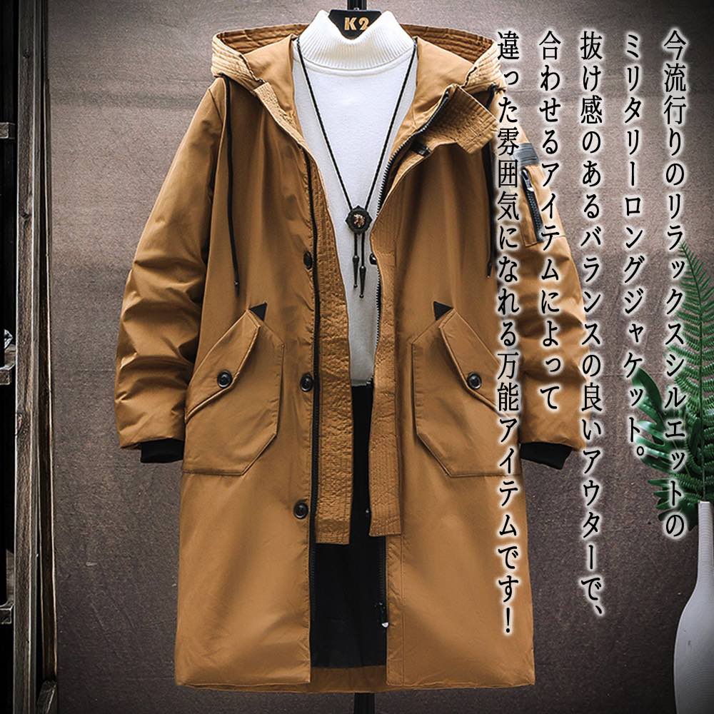 【20%OFFクーポン〜】綿入れ カーゴジャケット メンズ ロング丈 防風 防寒 おしゃれ モッズコート フード付きジャケット 長袖 厚手 柔らかい 軽い 作業着 プルオーバー ジップ ヒップホップ ワーク スポーティ 秋 冬