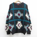L/古着 長袖 セーター メンズ 00s ネイティブ柄 ラグ柄 手編み ハンドニット シェットランドウール クルーネック 濃グレー spe 25oct04 中