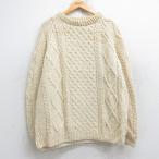 L/古着 長袖 アラン フィッシャーマン ケーブル セーター メンズ 90s 手編み ハンドニット ラグラン ウール クルーネック 生成り spe 25nov