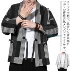 羽織り カーディガン メンズ 大きいサイズ 麻 七分袖 ストライプ 縦縞 リネン混 綿混 和柄 和服 法被 甚平 作務衣風 ジャケット 夏 涼しい 祭