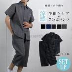 セットアップ メンズ 上下セット 半袖シャツ クロップドパンツ ルームウェア シジラ織り 和服 黒 紺 ストライプ 通気性 速乾性