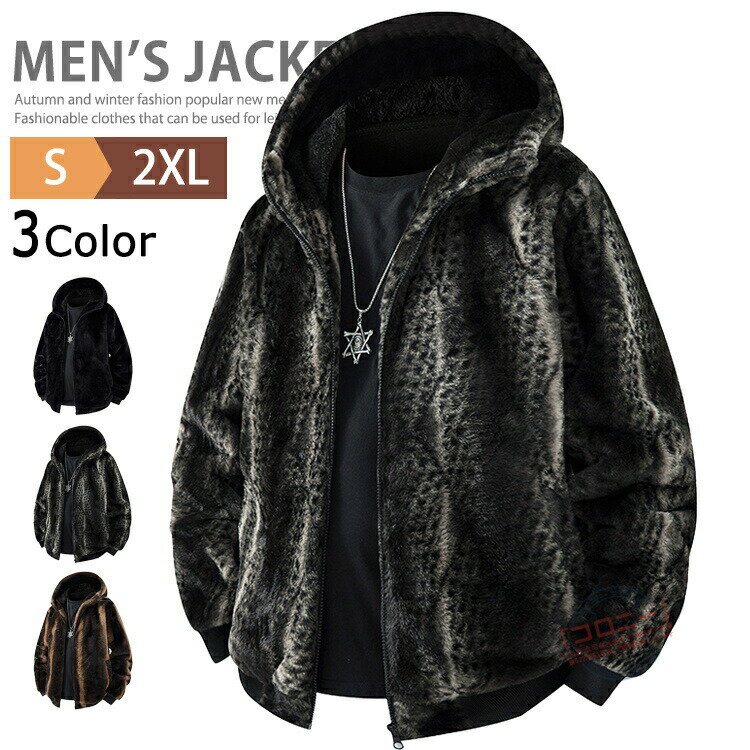 暖かい 防寒 ジャケット メンズ ファーコート 毛皮コート 裏起毛 ヒョウ柄 レオパード あったか アウター ボアジャケット フリースジャケット カジュアル おしゃれ ジャンパー ブルゾン ファージャケット フード付き ジップアップパーカー 厚手 秋冬