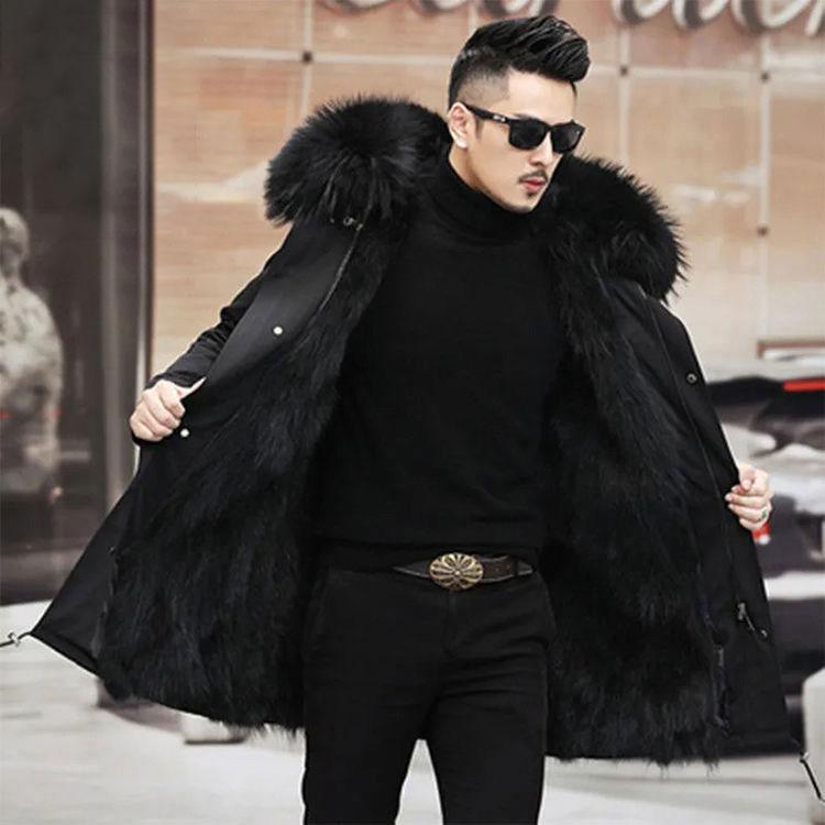 【期間限定10%OFF】毛皮コート ファーコート メンズ アウター ロングコート ロング丈 フード付き 防寒 ファー フェイクファー 裏ボア かっこいい 高級感 厚手 冬服