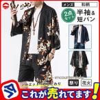 甚平セットアップ 夏服 羽織 メンズ ショートパンツ 花柄 浴衣風 鶴柄 2点セット 和風 着物風 サマー ハーフパンツ 七分袖 はおり 短パ