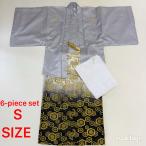 紋付袴 6点セット 着物 羽織 袴 長襦袢 羽織紐 角帯 裄70cm 袴丈80cm S シルバー 五つ紋 中古 4489