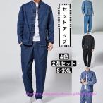 セットアップメンズデニム上下点セットロング長袖羽織はおり甚平和式チャイナスーツチャイナ服スウェット前開部屋着ルームウェア
