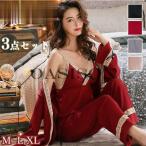 パジャマ レディース 春 秋 レース カップ付き ルームウェア 3点セット パンツ ナイトガウン キャミソール カーディガン 寝巻き 部屋着 大きい