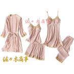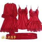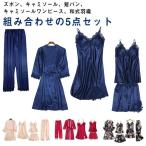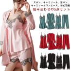 パジャマ レディース ルームウェア シルク パジャマ 5点セット ガウン キャミソール パンツ ワンピース パッド 上下セット セクシー