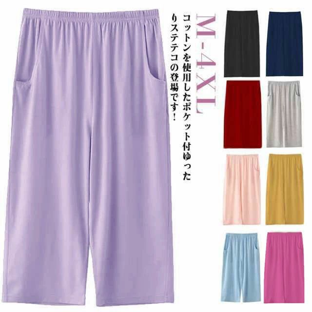 ワイドパンツ ステテコ ルームパンツ レディース コットン 綿 ルームウェア 部屋着 7分丈 ハーフパンツ 涼しい 春夏 ひざ下 イージーパンツ 通気性