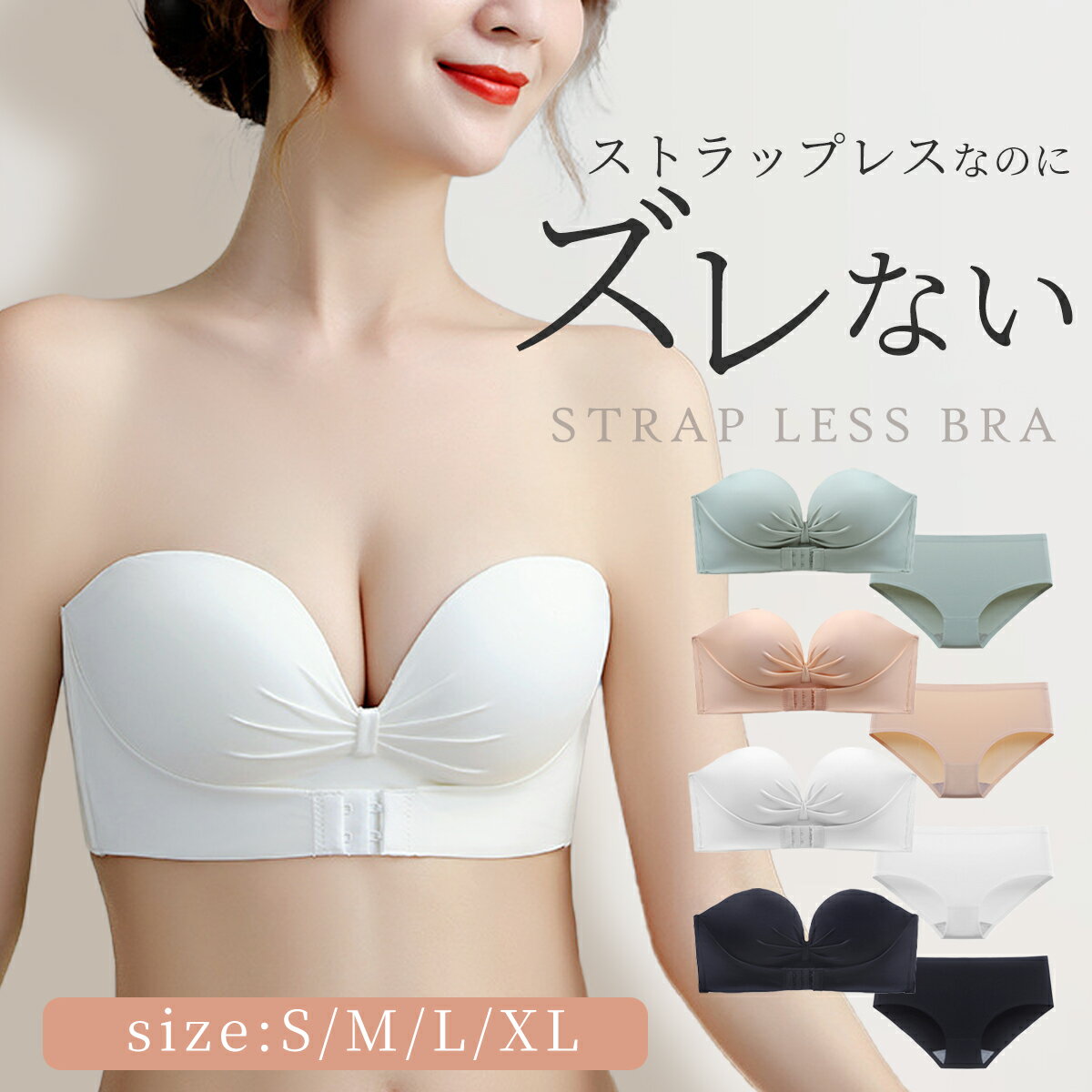 【Pt10倍】【レビュー記載でクーポン配布】【ストラップレスブラ セット】ズレない ノンワイヤー ブラ&ショーツ 谷間メイク 美胸 補正下着 盛れる バンドゥ 2way S M L XL レディース インナー