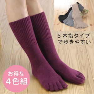 【楽天スーパーSALE_10%OFF】毛混口ゴムらくらく5本指ソックス 4色組 ウール混 五本指靴下 レディース靴下 ※納期2週間前後