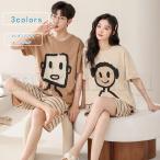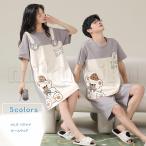 2セット メンズ レディース パジャマ ネグリジェ カップル アニマル ボーダー柄 コットン 薄手 半袖 丸首 ルームウェア 部屋着 ナイティ ナイトウェア 寝巻き