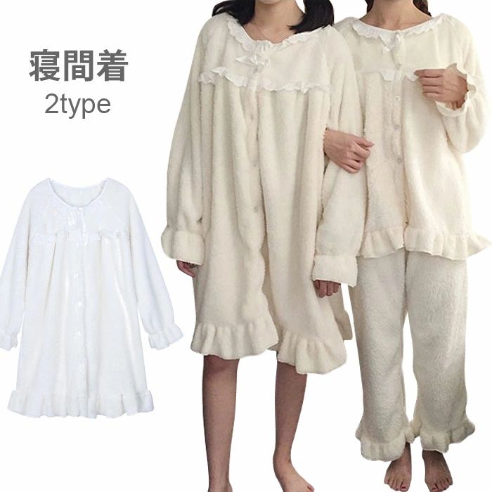 【送料無料】ルームウエア パジャマ 寝間着 レディース ワンピース セットアップ ボア レース付き 膝丈ワンピース ロングパンツ 長袖 丸襟 ボタン付き 前開き 厚手 ゆったり シンプル 純色 無地 かわいい ふわふわ ナイトウエア ハウスウエア パジャマ 秋新作
