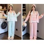 パジャマ ルームウェア かわいい おしゃれ セクシー ロマンティック ソフト 心地 温かい 女性 秋冬 お泊り ホームウェア ブルー ピンク 3点セット