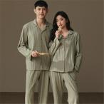 ペア パジャマ 長袖 男女2着 セット 綿100% 無地 シンプル 前開き 春 秋 着痩せ ストライプ 緑 ルームウェア ペアルック 冬 コットン カップル 上下セット