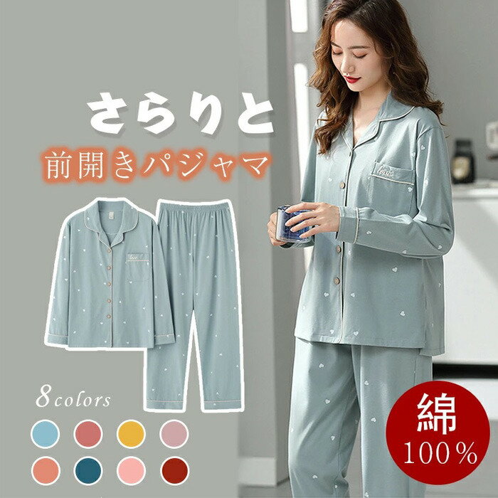 ★大特価15%OFFクーポン付き★パジャマ レディース ルームウェア 前開き 上下セット セットアップ 綿100% ハート柄 かわいい 春 夏 秋 大人 ナイトウェア 女性 寝間着 部屋着 パジャマ 前開き レディース ルームウェア 上下セット 長袖 胸ポケット付き 可愛い 秋冬 入院