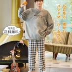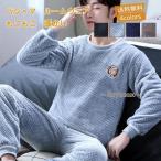 パジャマ メンズ ルームウェア 英字刺繍 クルーネック 長袖 上下セット 厚手 ポケット付き ゆったり もこもこ 暖かい シンプル 秋冬 きれいめ おしゃれ