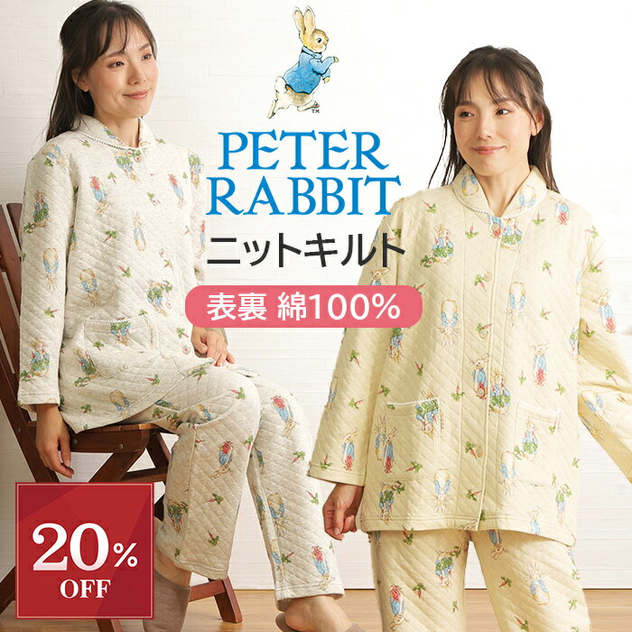 【ピーターラビット★20%OFF】【クーポン対象】\暖かキルト/レディース パジャマ 冬 長袖 ニットキルト 表裏 綿100% 衿付 長ズボン 綿入り 前開 かわいい 婦人 女性 敏感肌 やわらか 肌に優しい 温活 ナイトウェア S/M/L【nacrure】ギフト クリスマス プレゼント