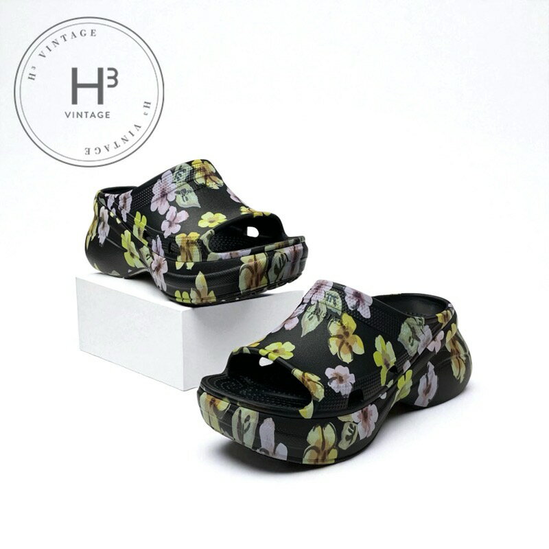 バレンシアガ BALENCIAGA Pool Crocs サンダル 靴 シューズ EVA ブラック マルチカラー クロックス フラワーモチーフ スライドサンダル ロゴ