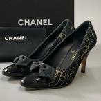 《美品》 CHANEL シャネル TWEED PATENT RIBBON PUMPS ココマーク リボン ツイードラメパンプス G31387 36 1/2 ブラック 箱 保存袋付きt18r 【中古】