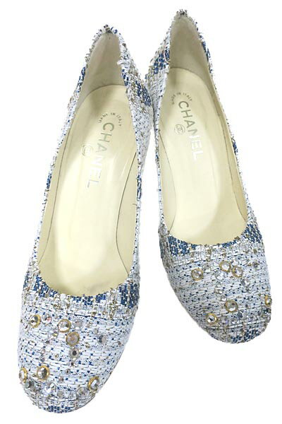 【中古】CHANEL シャネル 靴 パンプス レディ―ス ツイード ホワイトグレー系 ブルー ラインストーン サイズ37.5