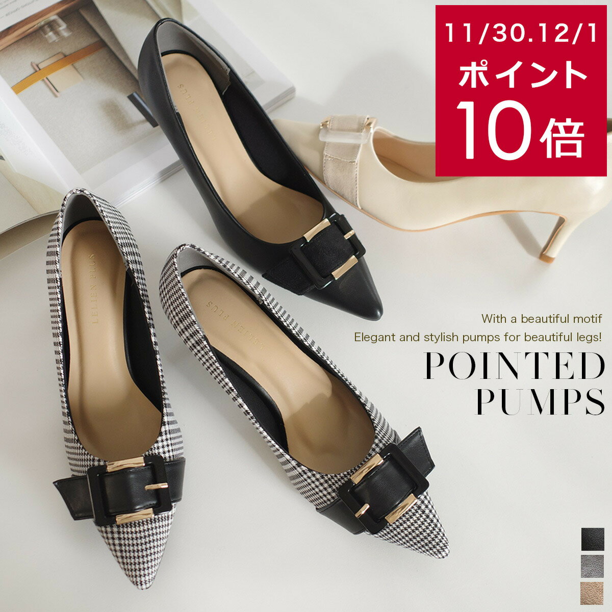 サイズ交換無料★パンプス 痛くない 美脚 滑らない かかとクッション バックルポインテッドトゥパンプス 6センチヒール 同色ヒール レディース 柔らか モチーフ付き ブラック ブラウン カーキ レッド 23.0 24.5 オフィス ルリアンプラス