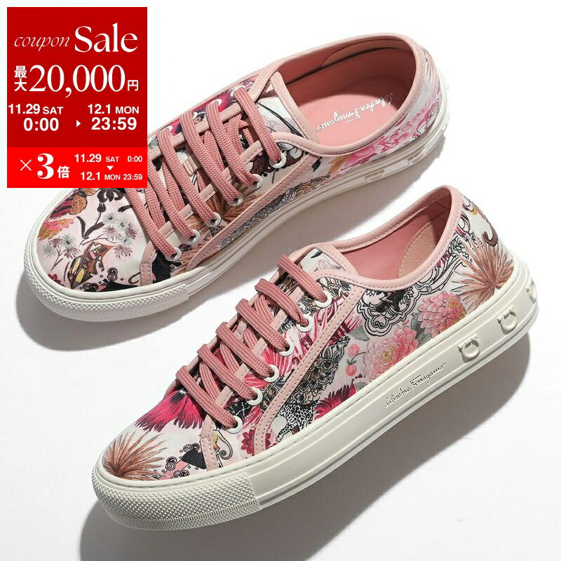 【最大2万円OFFクーポン対象・11/29~12/1限定】FERRAGAMO フェラガモ スニーカー 0737448 BORG PRINT ボルグ レディース フローラルプリント ロゴ ローカット プラットフォーム レースアップ シューズ 靴 PK-WH
