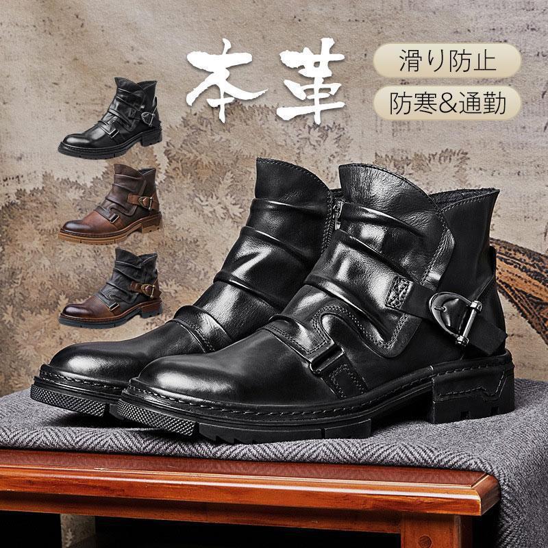【期間限定10%OFF】本革 ショートブーツ メンズ 牛革 高級感 革靴 かっこいい エンジニアブーツ 滑り防止 保温 暖かい 防寒靴 ボア付き カジュアル 暖かい